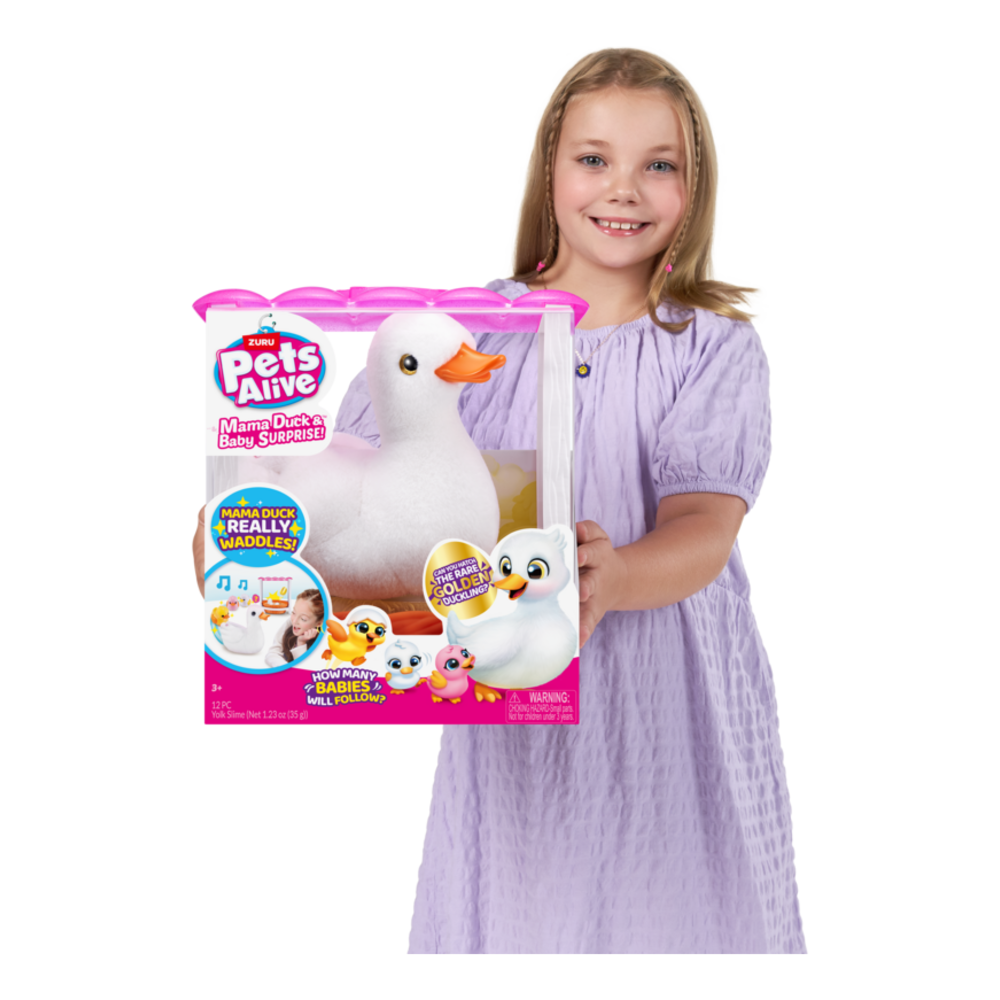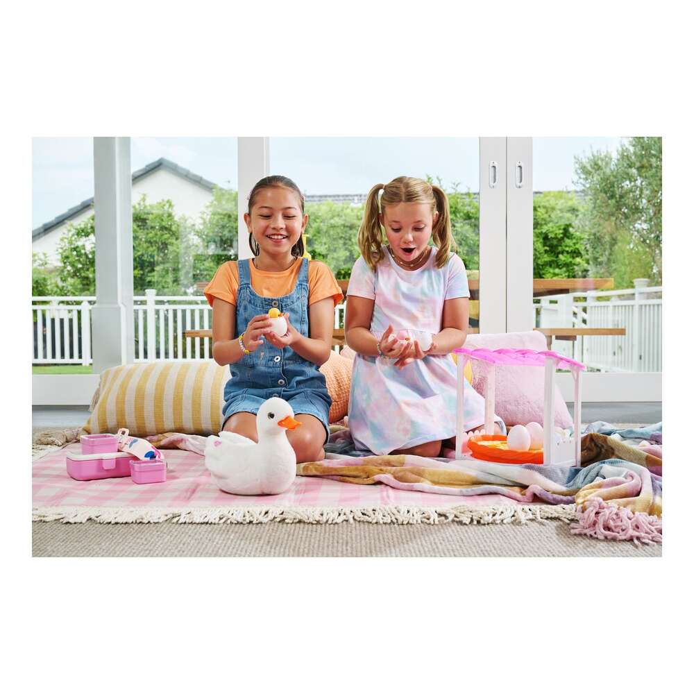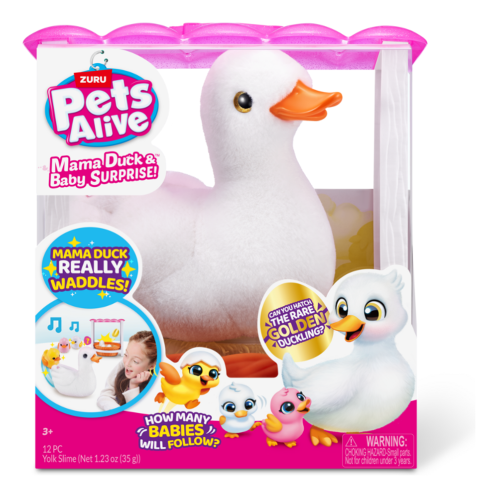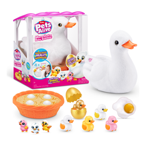Quack quack quack. It's hatching day and these ducklings are ready to play! Your Mama Duck is ready to hatch her own family! How many baby ducklings will she hatch? 2, 3 or 4? You might find the surprise yolk slime or cute stickers hidden in your egg! Mama Duck is full of surprises and loves to take her baby ducklings everywhere. Watch them follow as Mama Duck quacks and waddles. Will you be a lucky ducky and find the rare golden duckling? 1x Mama Duck Interactive Plush, 4x Surprise eggs with 2 guaranteed ducklings and 2 additional surprises.
