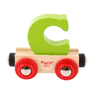 Bigjigs Rail Name carriages are loaded with a brightly coloured wooden letter or number. Each letter or number is removable and can be interchanged with other wagons and carriages in your wooden train set.