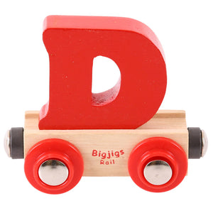 Bigjigs Rail Name carriages are loaded with a brightly coloured wooden letter or number. Each letter or number is removable and can be interchanged with other wagons and carriages in your wooden train set.