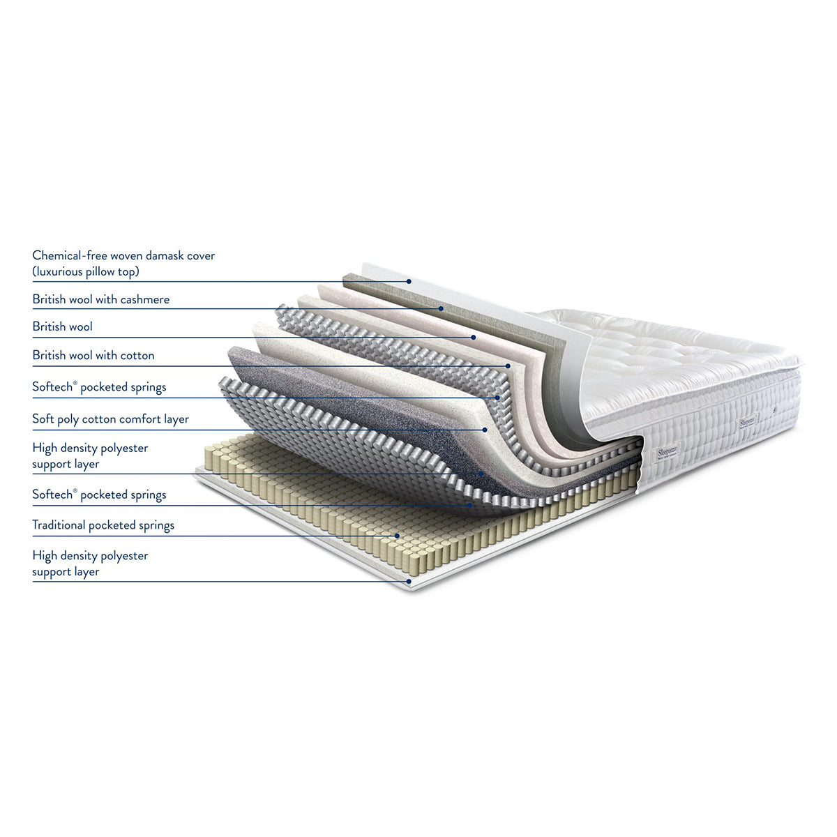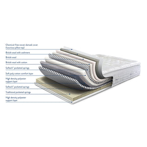 The SleepEezee Perfectly British Mayfair Mattress features 3200 pocket springs, a sumptuous pillow top, and layers of British wool and cashmere for medium-soft support and exceptional comfort.