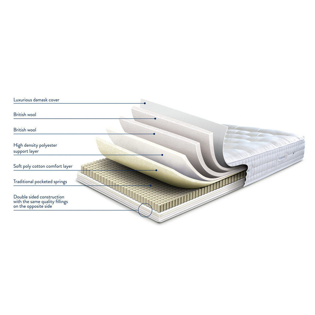 Natural temperature regulation. Made from 100% British wool and silk. Keeps you cool in summer and warm in winter. Features calibre edge side support for a firmer edge.