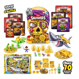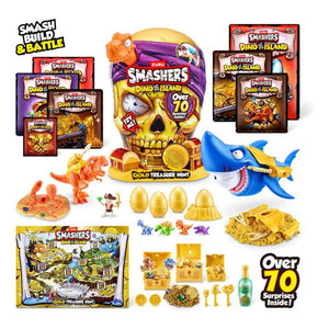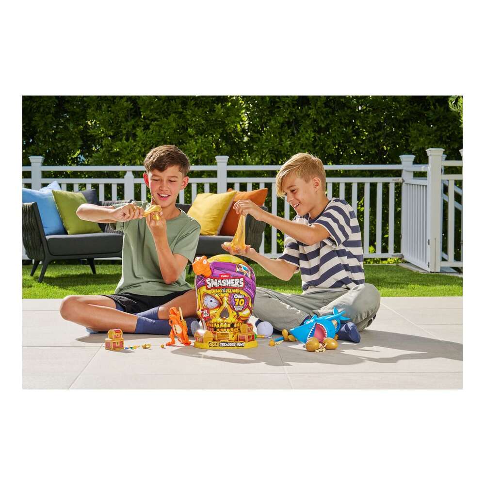 X marks the spot. Can you find the hidden treasure among the Smashers Dino Island Gold Treasure Hunt? Where 70+ surprises await to challenge your courage! Navigate through a battle of dinosaurs and sharks, where land meets sea in the fight to defend ancient treasures of gold and gems. Dig for hidden treasures all while discovering special collectibles on the way. like the one-of-a-kind golden dino, to elevate your Smashers collection to epic proportions!