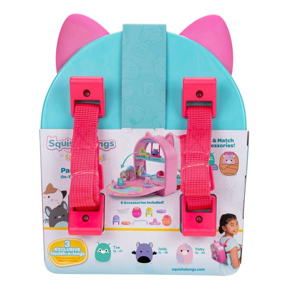 Introducing Squish-a-longs, your favourite Squishmallows in an all-new 1” size! Mini-Squish characters are highly collectible, transform into wearable wonders, and are perfect for on-the-go adventures. The Party Pack On-the-Go Playset is a backpack with adjustable straps and a front storage pocket that transforms into an epic party play scene. It’s the ultimate party destination with multiple play areas, including a second-story lounge with a working swing, 3 Mini-Squish, and 9 Squish Furnishings, such as cosy bean bag chairs and a pool floatie. Join the fun with over 140+ Mini-Squish available in playsets, multipacks, assortments, and more - the possibilities for adventure are endless! Includes: (3) 1” Mini-Squish (1) Transforming Backpack Playset with adjustable straps and storage pocket (9) Squish Furnishings