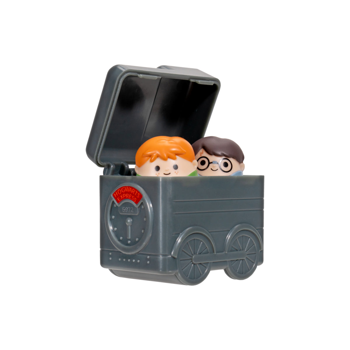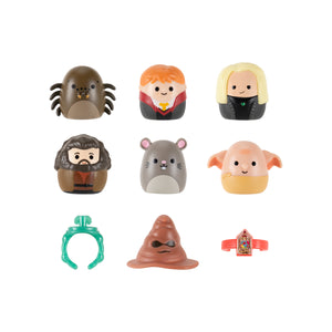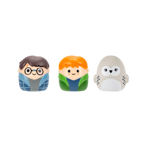Inspired by the iconic journey from the Muggle World to the Wizarding World, this official Harry Potter Squish-a-longs playset includes Mini-Squish Harry Potter, Ron Weasley, and Hedwig the Owl to play with or display at King's Cross Station, on the Hogwarts Express, or spinning through Platform 9 3/4. Features unique accessories like a Chocolate Frog clip-on, closes into a portable Hogwarts School Trunk, and fits up to 5 Mini-Squish to take on the go. Bring home the magic with Harry Potter Squish-a-longs and join the Squad today!