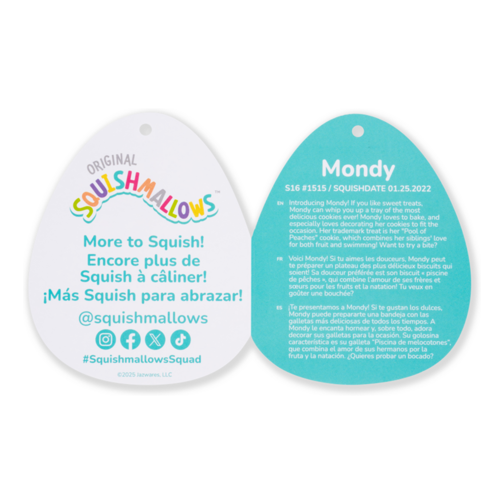 "Introducing Mondy! If you like sweet treats, Mondy can whip you up a tray of the most delicious cookies ever! Mondy loves to bake, and especially loves decorating her cookies to fit the occasion. Her trademark treat is her ""Pool of Peaches"" cookie, which combines her siblings' love for both fruit and swimming! Want to try a bite? Meet your new bestie, Mondy! Each Squishmallow plush comes with its own unique name and bio and makes the perfect cuddly companion for comfy nights in or long flights out. Mondy is only by Original Squishmallows. Join the Squad today!"