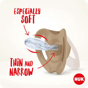 Unfortunately, babies can’t explain why they love their NUK Star so much. But we suspect it’s because of the pleasant feeling in their mouths: the special soft zone on the upper side nestles very gently against the palate, while the underside of the NUK Star leaves room for the tongue’s natural sucking movements.