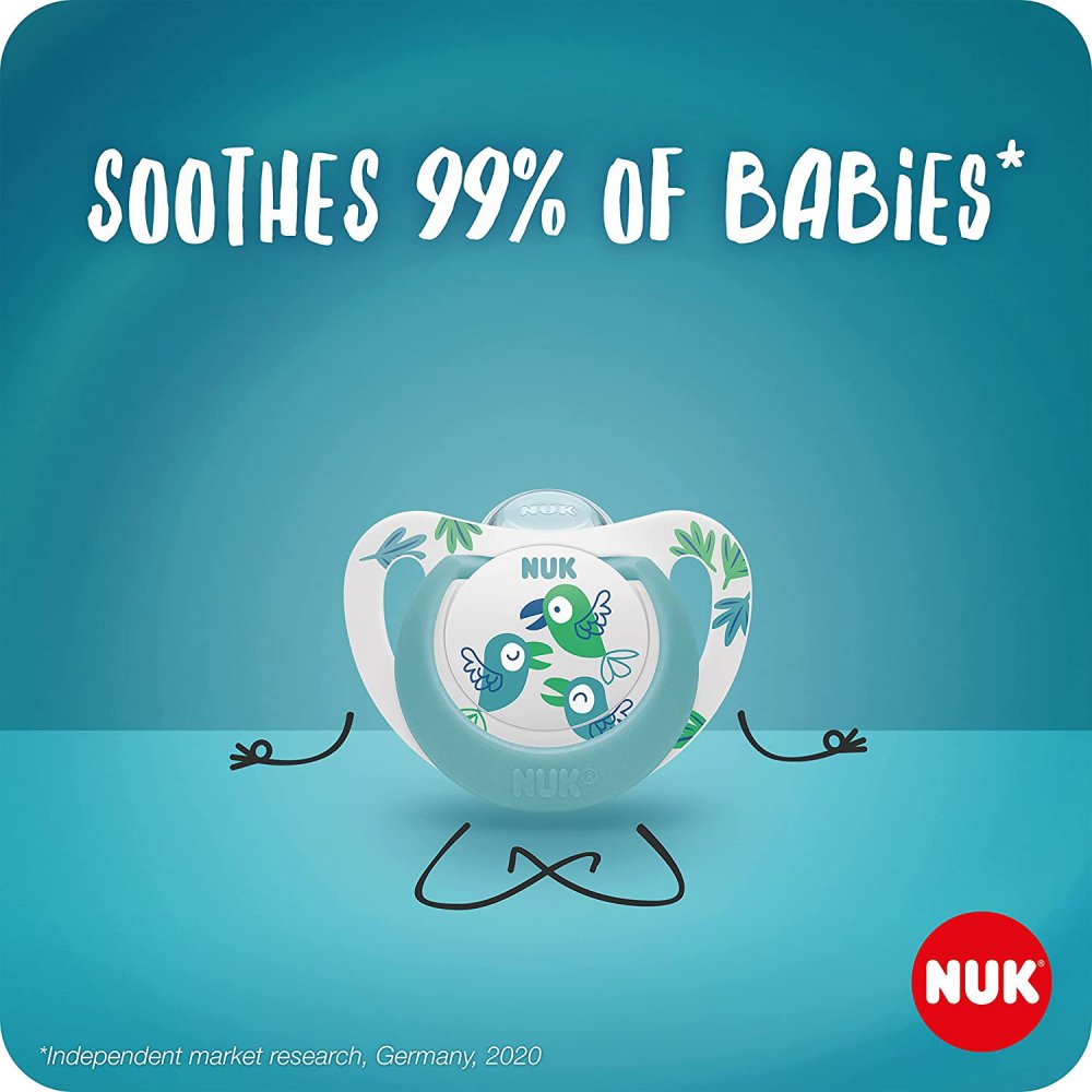 NUK Star Day & Night Soothers, 18-36 Months. Isn’t it great when there’s something you can always rely on? The NUK Star soother is just that. 99% of babies are soothed by it*. 96% of breastfeeding mothers appreciate that it’s breastfeeding-friendly*. And more than 90% of orthodontists recommend it because of its jaw-friendly shape.*