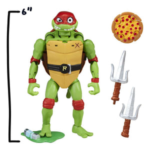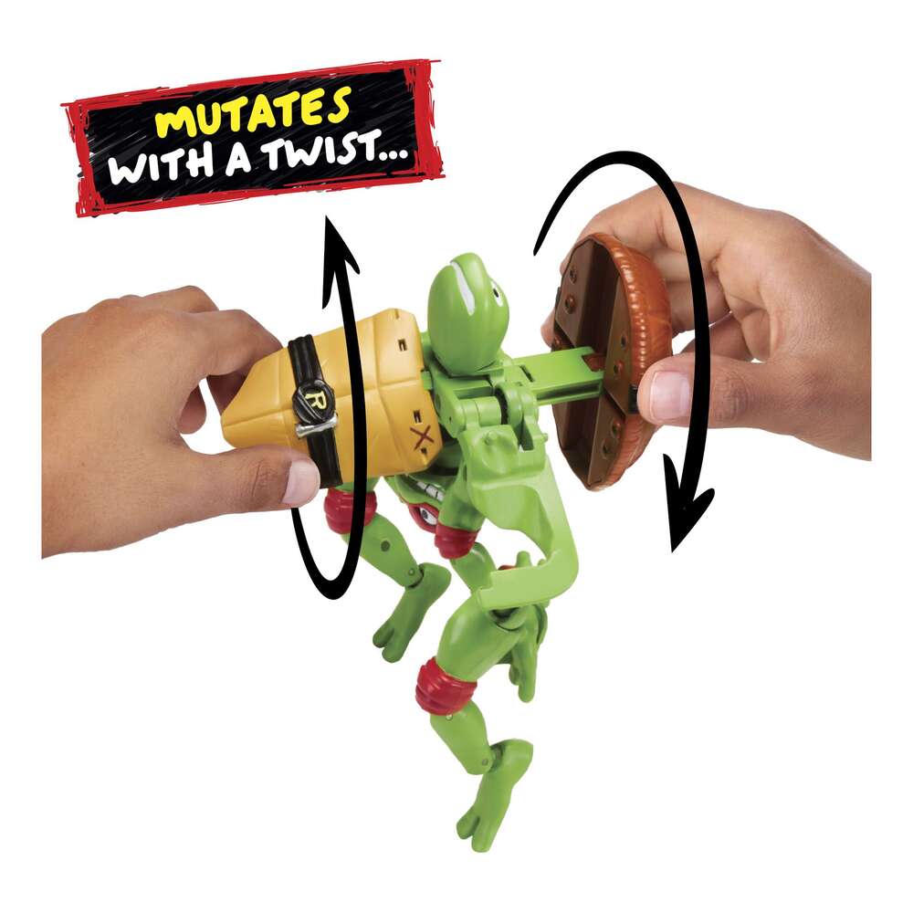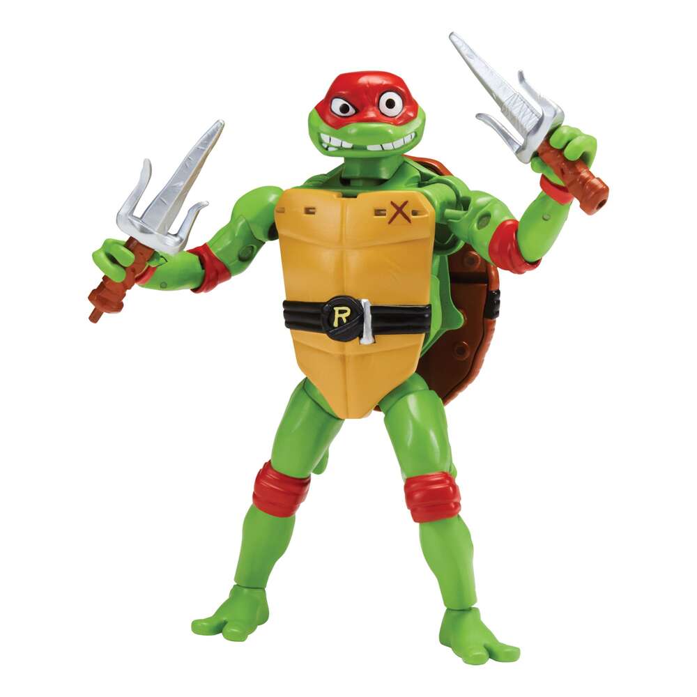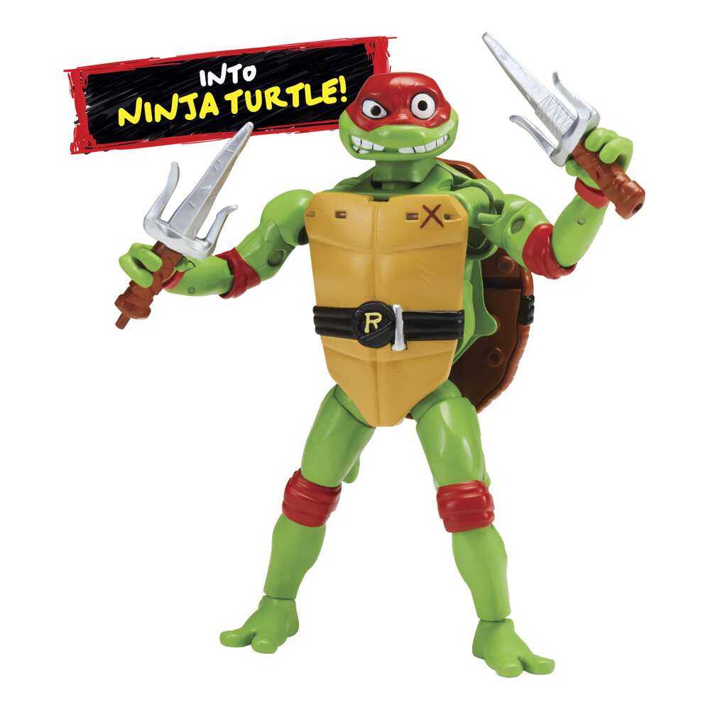 Ooze turned these teens from pet turtles to a crime-fighting ninja team! Recreate the iconic mutation at home with the Pet to Ninja figures. The transformation is easy (and less messy than using Ooze)! Start by lifting the back shell of Mutations Deluxe 5.5-Inch Raphael and extending his legs. Then, pull on his front shell and twist to transform! Snap the shells back into place and jump into action! Highly poseable, Raph in his ninja form is ready for action-packed battle poses! Highly detailed with accessories including a pizza throwing star, and display stand.
