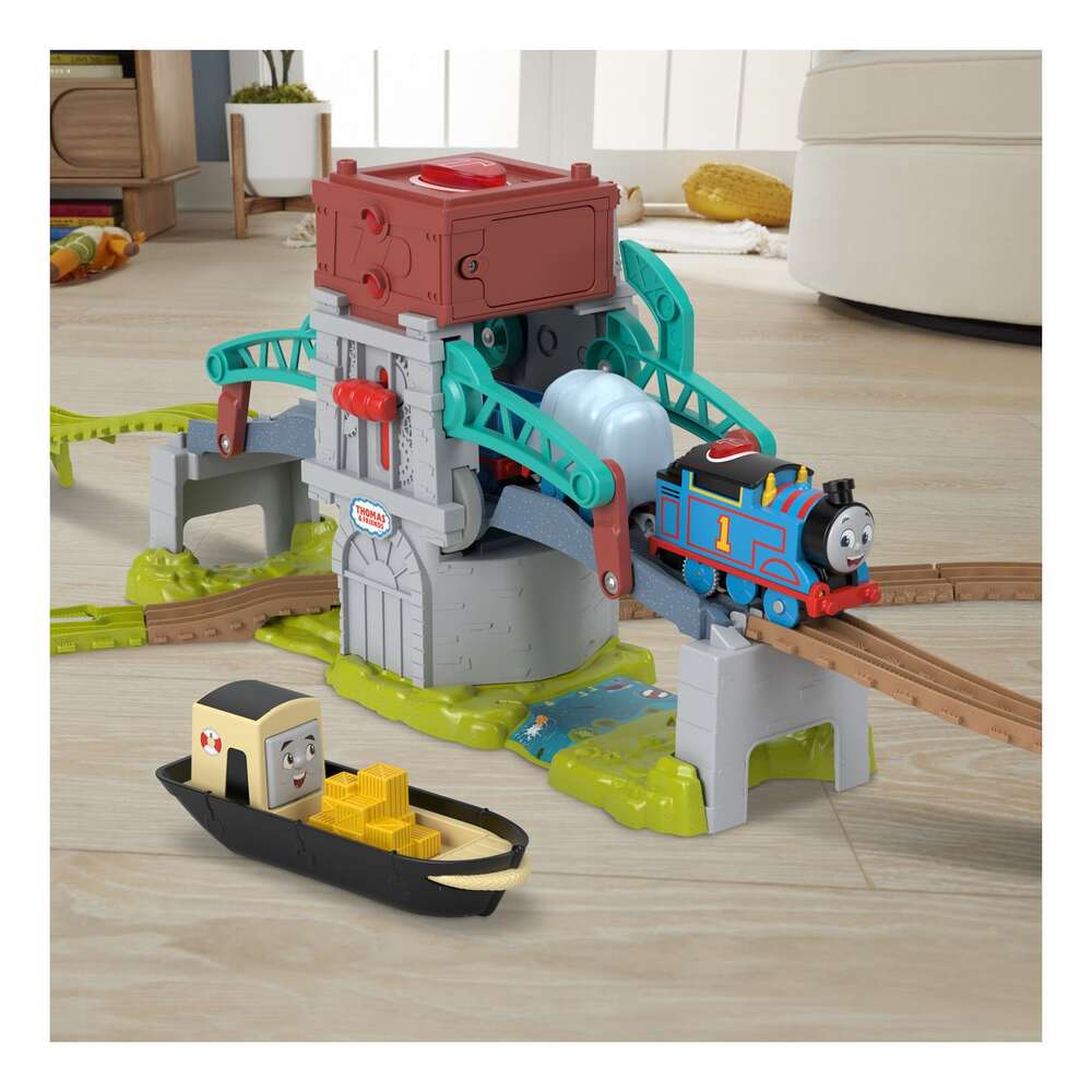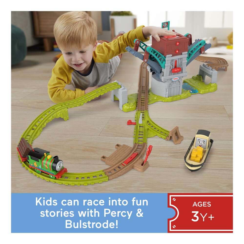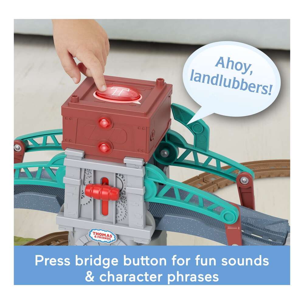 Preschool kids can bring the island of Sodor to life at home with this Thomas & Friends Talking Bulstrode & Which-Way Bridge playset from Fisher-Price. This interactive toy train set features real character phrases and sounds, a kid-controlled drawbridge, and lots of railway action with friends Percy and Bulstrode. Kids can set the scene by pressing the button on top of Which-Way Bridge to hear fun sounds, music and phrases. Then send motorized Percy racing around the track to deliver cargo from the docks all around Sodor! Colors and decorations may vary.