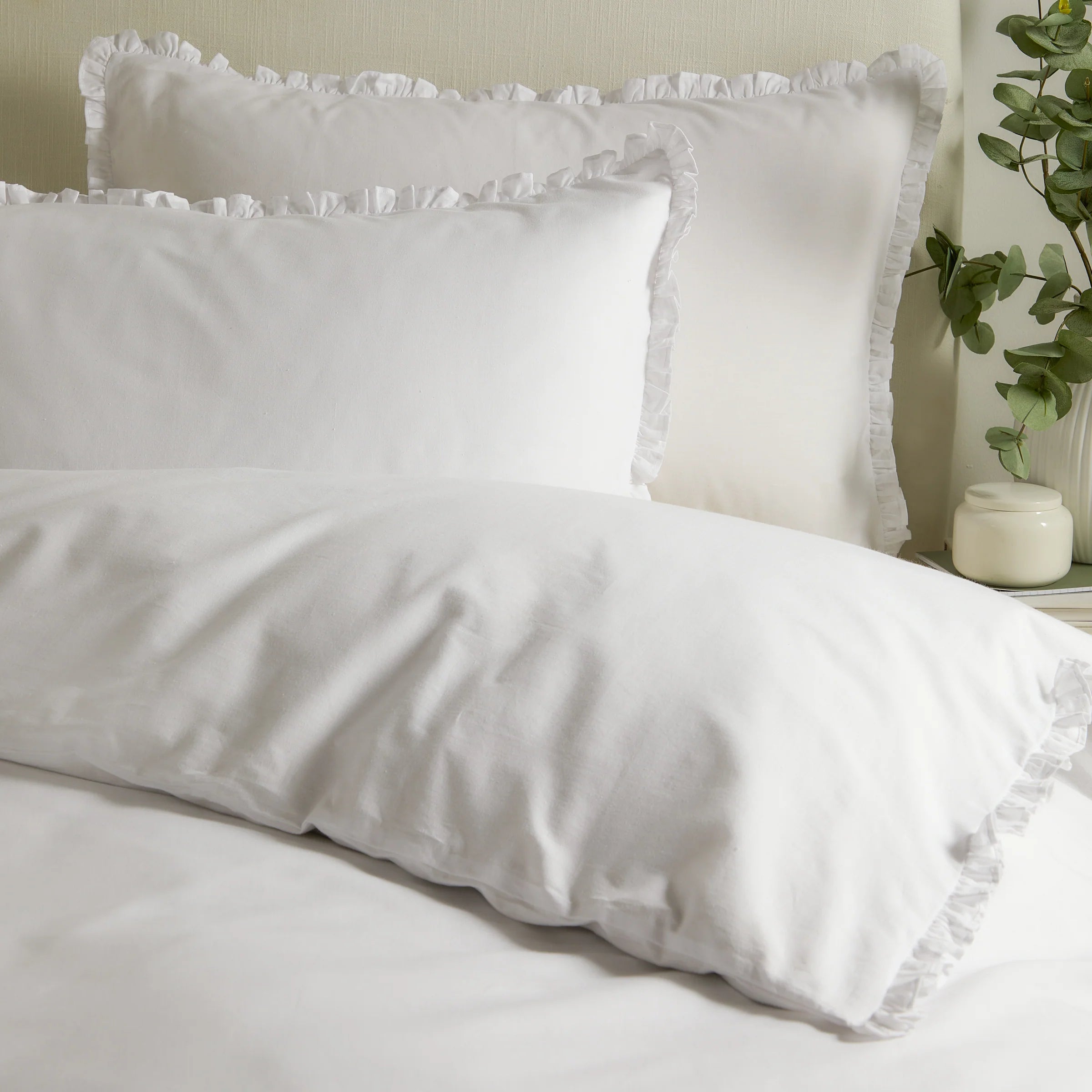 The minimalist design, featuring delicate ruffle detailing along the duvet and pillowcases, adds a refined yet charming aesthetic. Suitable for both traditional and modern interiors, the versatile tones and understated elegance make it an ideal choice for those who value timeless design. This set thoughtfully merges comfort with a sense of natural inspiration, perfectly balancing style and practicality.