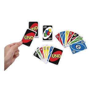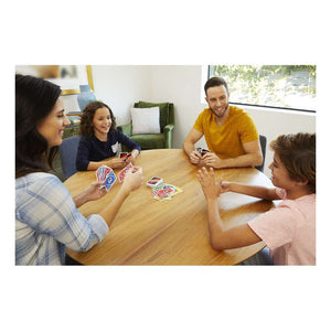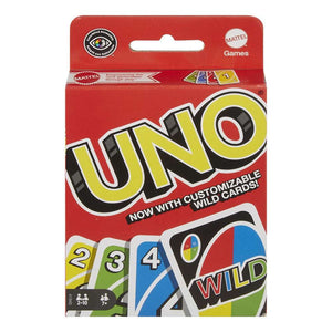 UNO is the classic card game of matching colors and numbers that is easy to pick up…impossible to put down and now comes with customizable Wild Cards for added excitement! Players take turns racing to get rid of all their cards by matching a card in their hand with the current card shown on top of the deck either by color or number. Special Action cards deliver game-changing moments and help defeat opponents! Use the Swap Hands card to change hands with any other opponent and write your own rules using the 3 customizable (and erasable) Wild Cards! You'll find 19 of each color (red, green, blue, and yellow), plus 8 Draw Two, Reverse and Skip cards in every color, along with 4 Wild Cards, 4 Wild Draw Four cards, 1 Wild Swap Hands Card and 3 Wild Customizable cards. If you can't make a match, you must draw from the central pile! Don't forget to shout “UNO” when you only have one card remaining! The player to rid themselves of all the cards in their hand scores points for any cards their opponents are left holding. The first player to reach 500 points wins. Get Wild 4 UNO! Includes 112 cards and instructions. Each sold separately, subject to availability. Colors and decorations may vary.