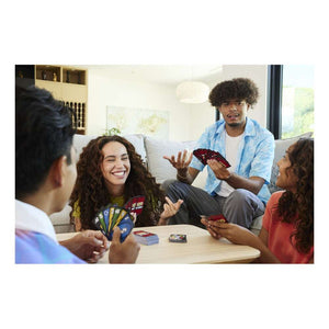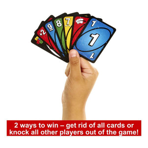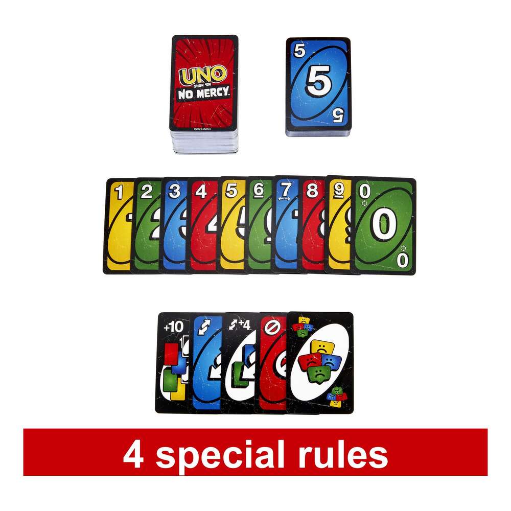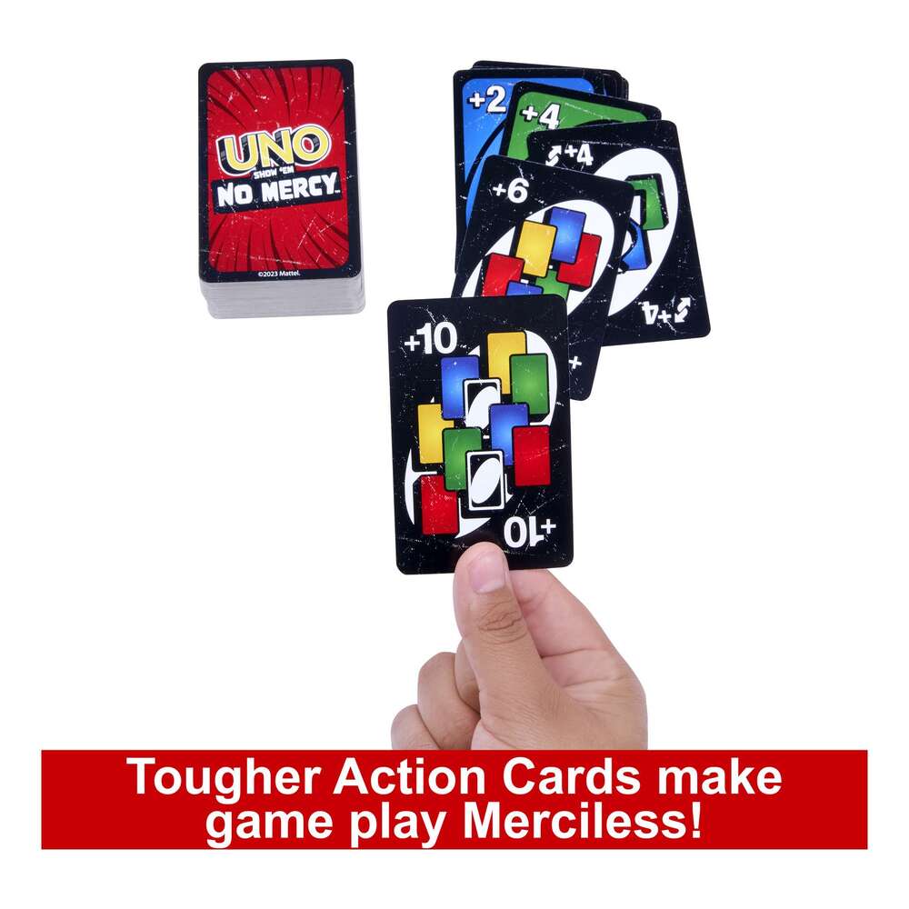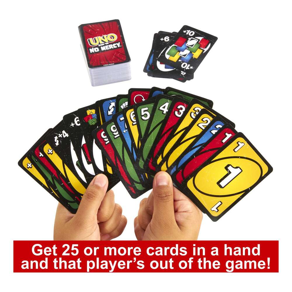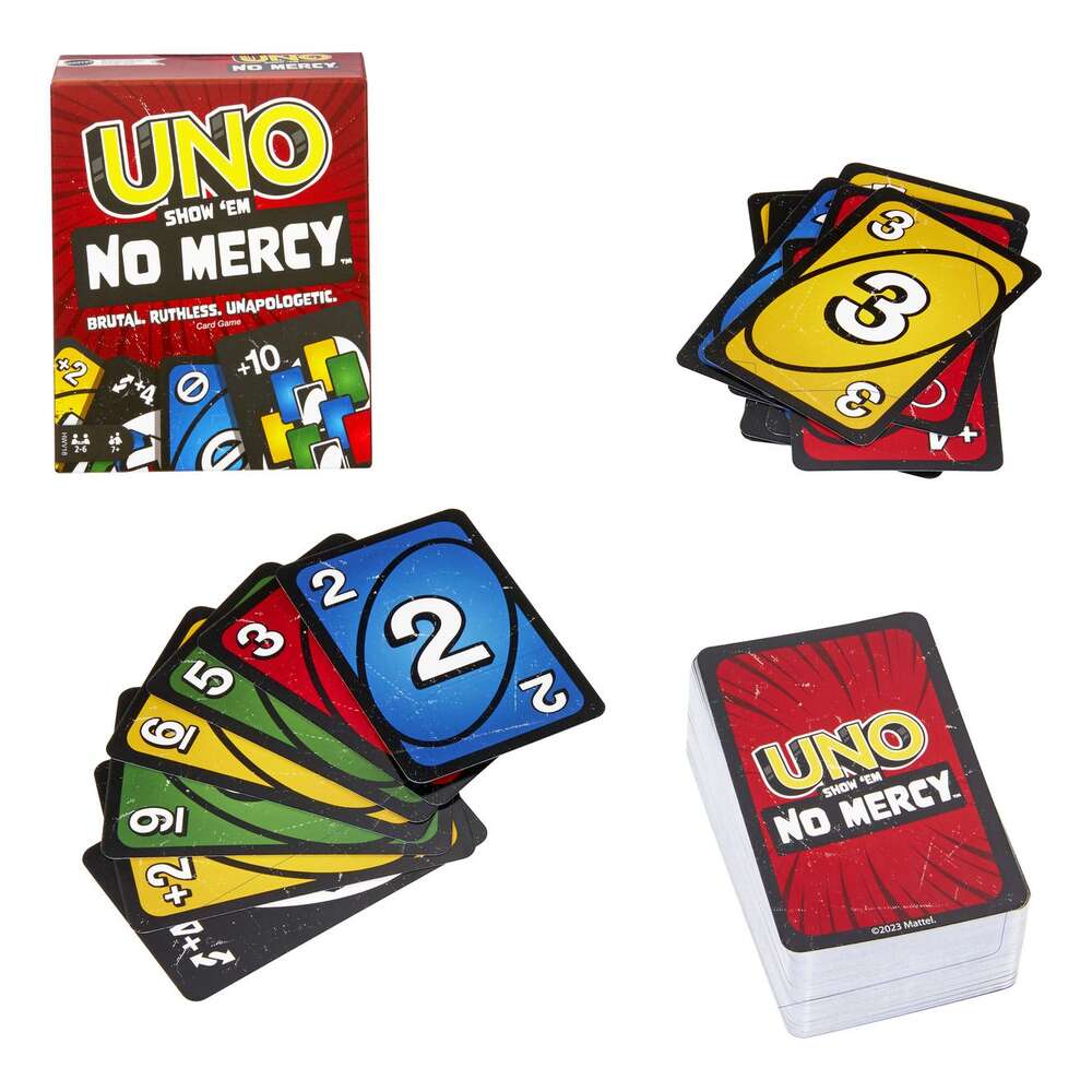UNO Show 'Em No Mercy is a brutal, ruthless version of the classic UNO card game. In addition to standard action cards like Skip, Reverse, and Draw 2, No Mercy comes with Wild Draw 6, Wild Draw 10, Skip Everyone, Discard All, and the new Wild Color Roulette - a card that forces the next player to choose a color and then draw until they get a card of that color. In addition to new action cards, many popular house rules have been included in the actual rules. Stacking is legal. 7s swap and 0s pass hands. And when you can't play a card, you must draw until you can play. But the biggest change in UNO Show 'Em No Mercy is the Mercy Rule. If you ever have 25 or more cards in your hand, you get kicked out of the game.