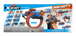 Insane combos, ammo and action with X-Shot Insanity! Load up the Mad Mega Barrels 72-dart capacity barrel to take out multiple targets from up to 30m / 98 feet away! It comes with 3 modular dart storage units to hold an additional 66 darts!