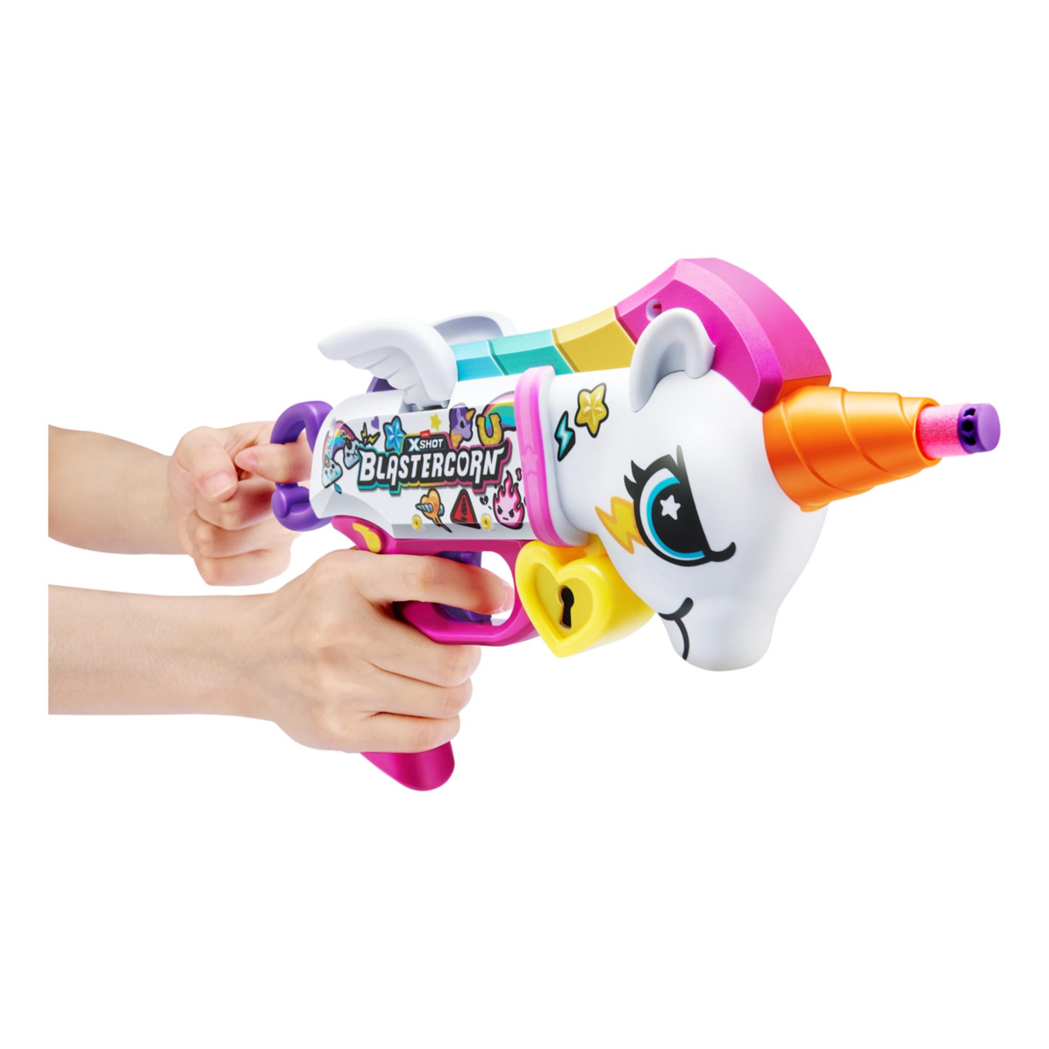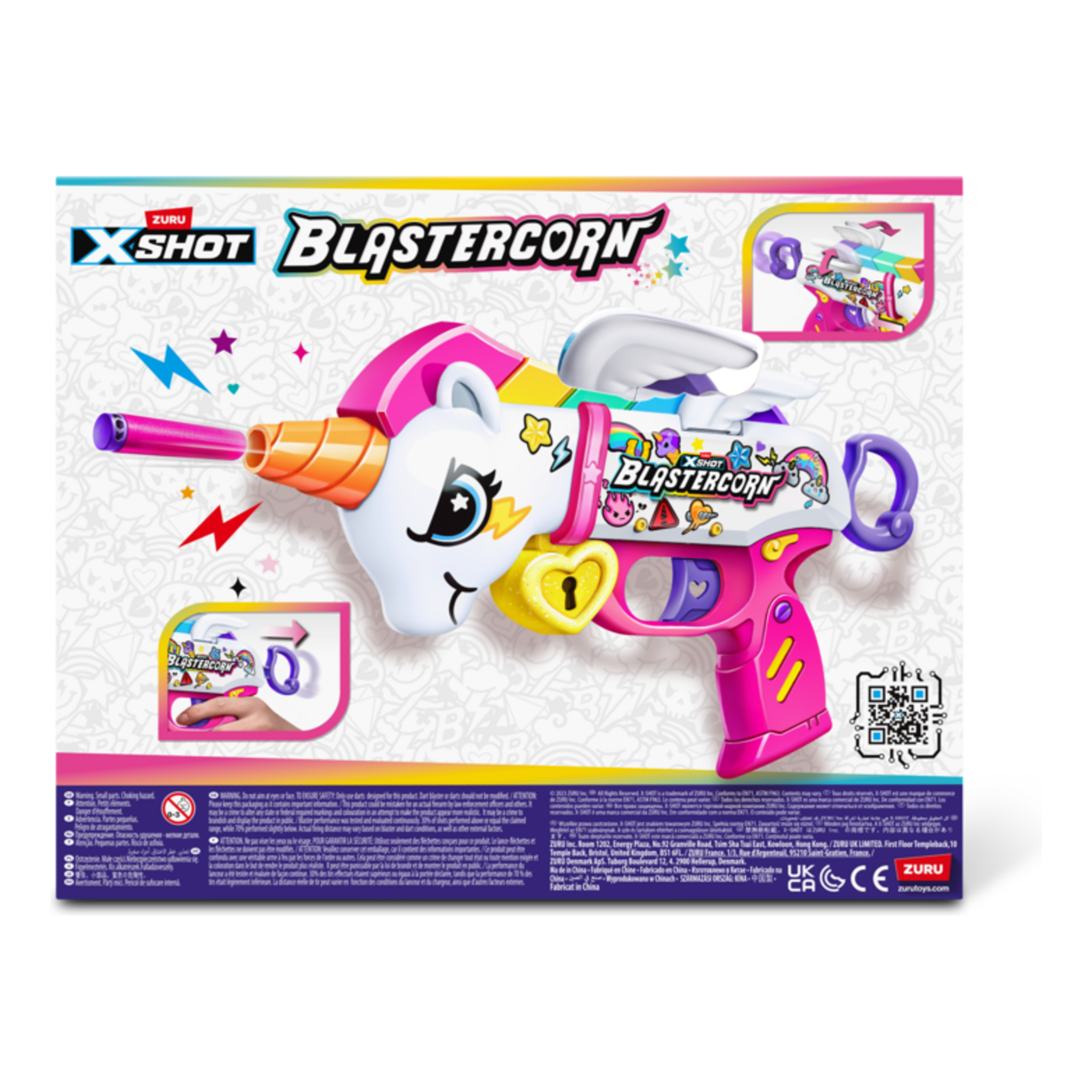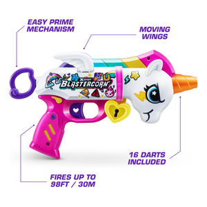 Are you game to tame the Blastercorn? Introducing the newest member in the XSHOT family, the Blastercorn! Unleash 16 Air Pocket Technology foam darts in seconds with the Blastercorns simple pull to prime reload. With a powerful range of 27m/90ft, the XSHOT Blastercorn takes on targets effortlessly. Watch its wings flap as you unleash the power of the Blastercorn on your enemies!